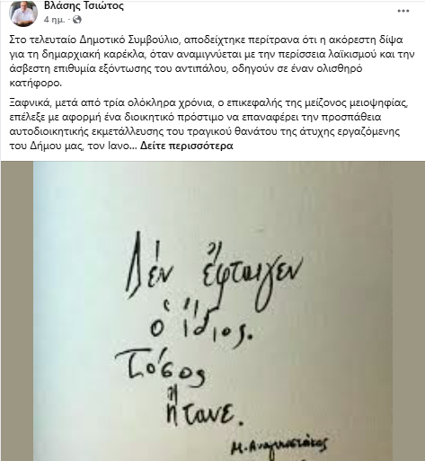 Ξαφνικά, μετά από τρία ολόκληρα χρόνια, ο επικεφαλής της μείζονος μειοψηφίας, επέλεξε με αφορμή ένα διοικητικό πρόστιμο να επαναφέρει την προσπάθεια αυτοδιοικητικής εκμετάλλευσης του τραγικού θανάτου της άτυχης εργαζόμενης του Δήμου μας, τον Ιανουάριο του 2023.