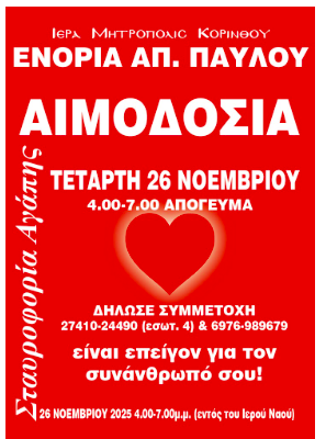 26 ΝΟΕΜΒΡΙΟΥ 2025 4.00-7.00μ.μ. (εντός του Ιερού Καθεδρικού Ναού Απ. Παύλου Κορίνθου)
