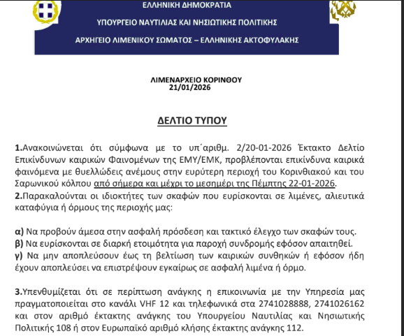Η ανακοίνωση από το λιμεναρχείο Κορίνθου: