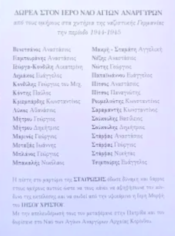80 χρόνια μετά, ο Δήμος Κορινθίων, με σεβασμό στην ιστορική μνήμη και ικανοποιώντας το αίτημα της τοπικής κοινωνίας δημιουργεί στην Αρχαία Κόρινθο ένα αναθηματικό μνημείο, με τα ονόματα των 29 συμπολιτών μας, δηλαδή των: