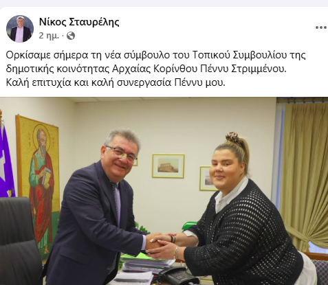 ΚοινωνικάΤοπική Αυτ/κηση ΑΡΧΑΙΑ ΚΟΡΙΝΘΟΣ: Ορκίστηκε η νέα σύμβουλος του τοπικού συμβουλίου… 20 Οκτωβρίου, 2025 FacebookTwitterPinterestWhatsApp Η ανάρτηση του δημάρχου Κορινθίων Ν. Σταυρέλη: