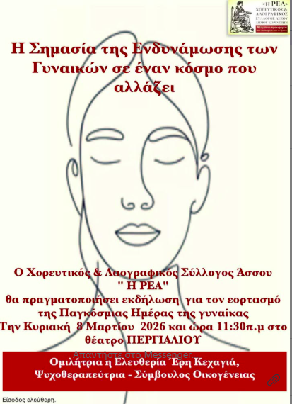 “Την Κυριακή 8 Μαρτίου 2026, με αφορμή την Παγκόσμια Ημέρα της Γυναίκας, ο Χορευτικός και Λαογραφικός Σύλλογος Άσσου «Η ΡΕΑ» διοργανώνει μια ξεχωριστή εκδήλωση αφιερωμένη στη δύναμη, τον ρόλο και τη σύγχρονη πορεία της γυναίκας.