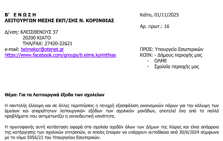 Η ανακοίνωση από την Β΄ Ένωση Λειτουργών Μέσης Εκπαίδευσης Κορινθίας: