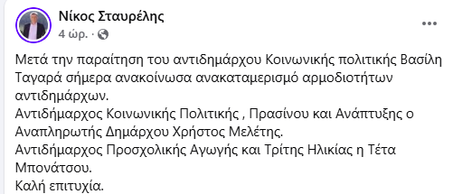 Ο δήμαρχος μοίρασε τις αρμοδιότητες του μέχρι πρότινος (έστω για λίγο) άμισθου αντιδημάρχου Β. Ταγαρά σε ήδη αντιδημάρχους!