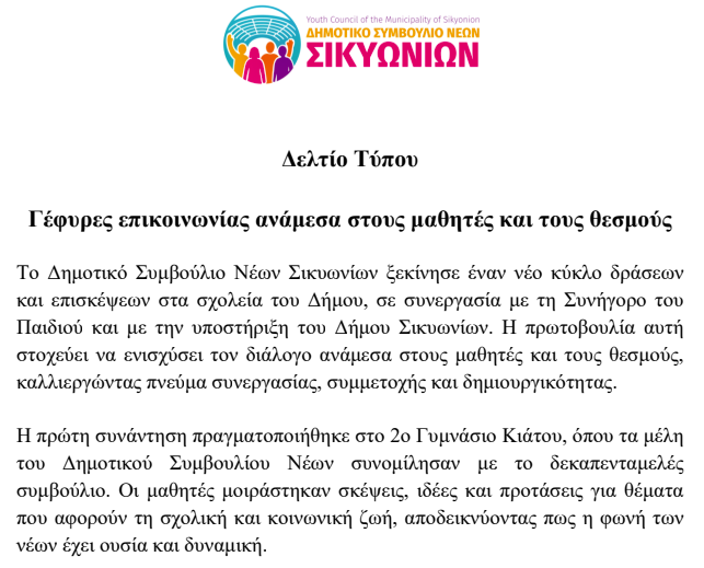 Κοινωνικά Δημοτικό συμβούλιο νέων Σικυωνίων: “Γέφυρες επικοινωνίας ανάμεσα στους μαθητές και τους θεσμούς” 15 Οκτωβρίου, 2025 FacebookTwitterPinterestWhatsApp Σε ανακοίνωση από το Δημοτικό συμβούλιο νέων Σικυωνίων αναφέρεται: