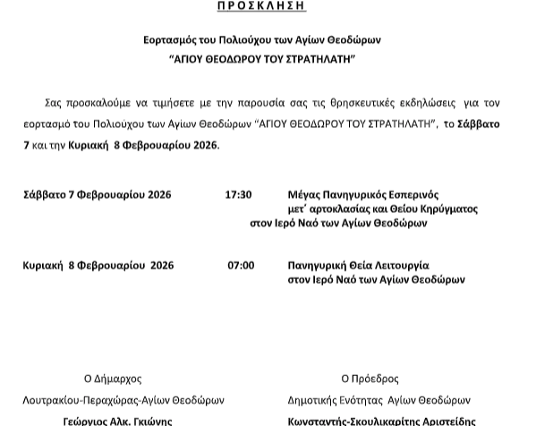 Κοινωνικά Εορτασμός του Πολιούχου των Αγ. Θεοδώρων… 3 Φεβρουαρίου, 2026 FacebookTwitterPinterestWhatsApp Η πρόσκληση: