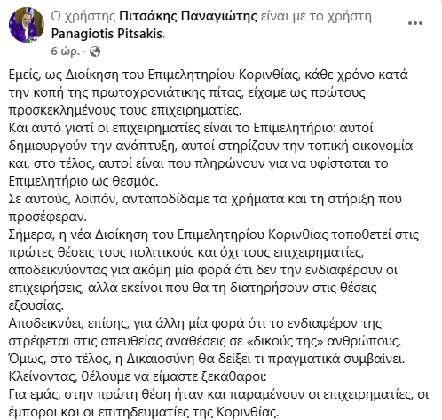 Δείτε τώρα την ανάρτηση από τον τέως πρόεδρο (…έστω από σπόντα) του επιμελητηρίου Κορινθίας Π. Πιτσάκη: