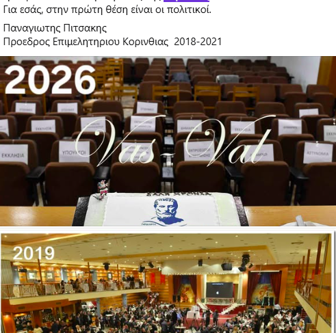 Ο Πιτσάκης στην ανακοίνωσή του παρακάτω “ενοχλείται” που η νέα διοίκηση του επιμελητηρίου Κορινθίας τοποθετεί στις πρώτες θέσεις για την πρωτοχρονιάτικη πίτα τους πολιτικούς και όχι τους επιχειρηματίες! Λες και αυτό δεν συμβαίνει, κακώς βέβαια, γενικά σε όλες τις εκδηλώσεις που γίνονται, κοπές πίτας …κτλ!