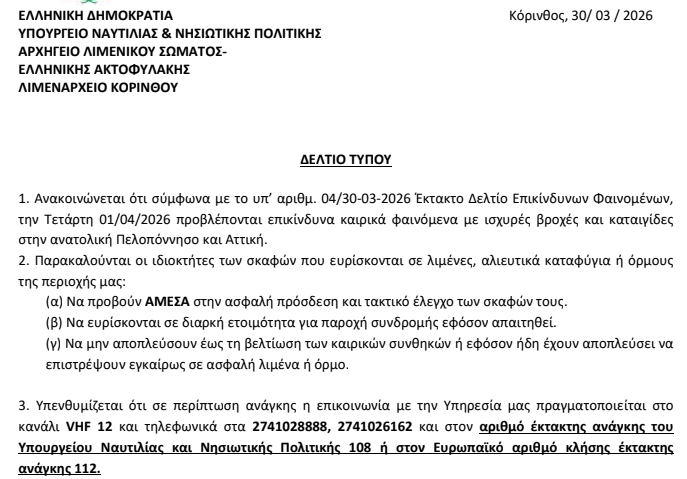 Κοινωνικά Η ανακοίνωση από το λιμεναρχείο Κορίνθου για τα επικίνδυνα καιρικά φαινόμενα… 31 Μαρτίου, 2026 FacebookTwitterPinterestWhatsApp Η ανακοίνωση από το λιμεναρχείο Κορίνθου: