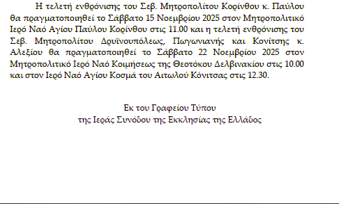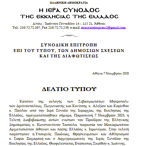 Η ανακοίνωση από την Ιερά Σύνοδο της εκκλησίας της Ελλάδας: