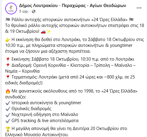 ΚοινωνικάΤοπική Αυτ/κηση Η εκκίνηση στο Λουτράκι -Ράλλυ αντοχής ιστορικών αυτοκινήτων… 1 Οκτωβρίου, 2025 FacebookTwitterPinterestWhatsApp Η ανακοίνωση από το δήμο Λουτρακίου-Π-ΑΓ.Θ: