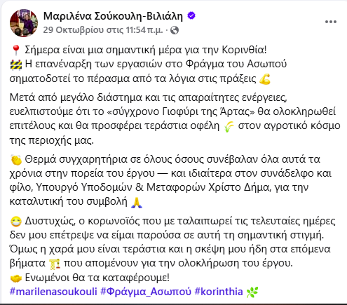 Ένα χαρακτηριστικό παράδειγμα η πρόσφατη ανάρτηση της βουλευτή της ΝΔ στην Κορινθία Μ. Σούκουλη που δείχνει πόσο χαρούμενη είναι επειδή απλά ξεκίνησαν για ακόμα μία φορά οι εργασίες στο φράγμα στον Ασωπό!