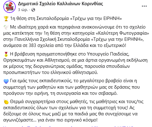 Κοινωνικά Η 1η θέση που κατέκτησε το δημοτικό σχολείο Καλλιάνων Κορινθίας 11 Δεκεμβρίου, 2025 FacebookTwitterPinterestWhatsApp Η ανάρτηση από το δημοτικό σχολείο Καλλιάνων Κορινθίας: