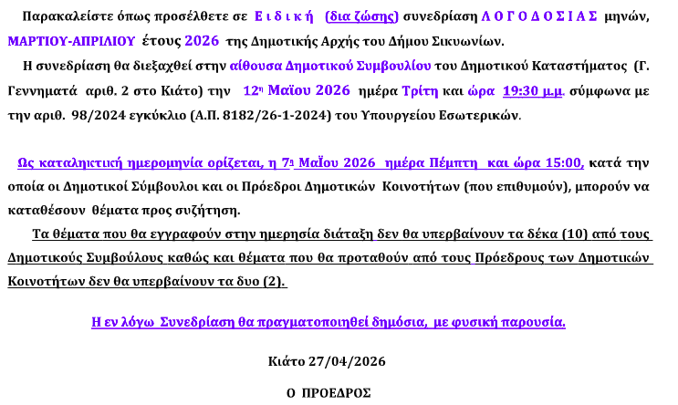 ΚοινωνικάΤοπική Αυτ/κηση ΚΙΑΤΟ: Η λογοδοσία της δημοτικής αρχής 29 Απριλίου, 2026 FacebookTwitterPinterestWhatsApp Η πρόσκληση στους δημοτικούς συμβούλους: