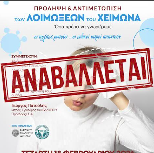 Από το δήμο Σικυωνίων ανακοινώνεται: «Ο Δήμος Σικυωνίων ενημερώνει τους πολίτες ότι η προγραμματισμένη ενημερωτική εκδήλωση με θέμα την πρόληψη και την αντιμετώπιση των λοιμώξεων του χειμώνα, η οποία επρόκειτο να πραγματοποιηθεί την Τετάρτη 18 Φεβρουαρίου στη Δημοτική Βιβλιοθήκη, αναβάλλεται.