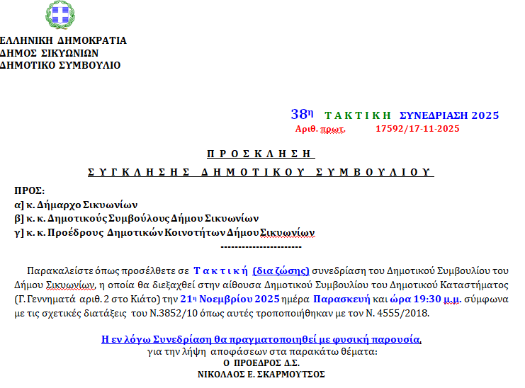 ΚοινωνικάΤοπική Αυτ/κηση ΚΙΑΤΟ: Τα θέματα που θα απασχολήσουν τη συνεδρίαση του δημοτικού συμβουλίου 20 Νοεμβρίου, 2025 FacebookTwitterPinterestWhatsApp Η πρόσκληση στους δημοτικούς συμβούλους: