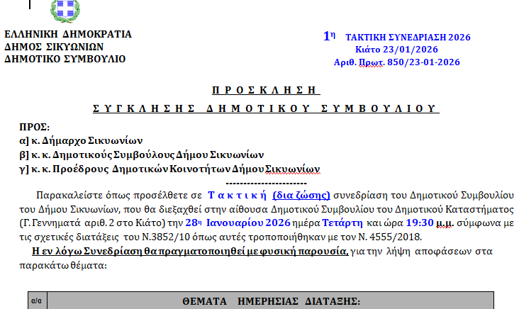 Η πρόσκληση στους δημοτικούς συμβούλους: