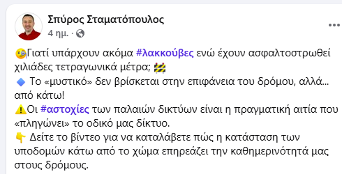 Λέει ο Σταματόπουλος ότι οι καθιζήσεις στους δρόμους και οι λακούβες είναι από τα ΠΑΛΙΑ δίκτυα …που έχουν αστοχία!