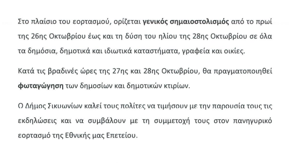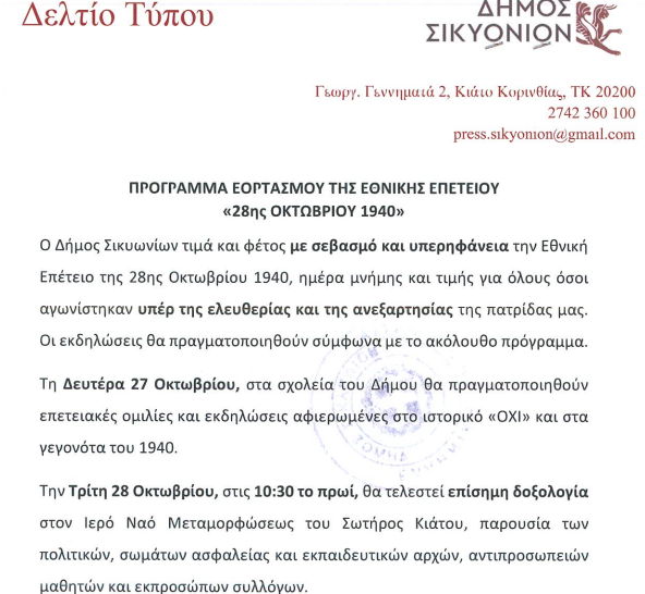 ΚοινωνικάΤοπική Αυτ/κηση ΚΙΑΤΟ: Το πρόγραμμα εορτασμού της 28ης Οκτωβρίου 22 Οκτωβρίου, 2025 FacebookTwitterPinterestWhatsApp Η ανακοίνωση από το δήμο Σικυωνίων:
