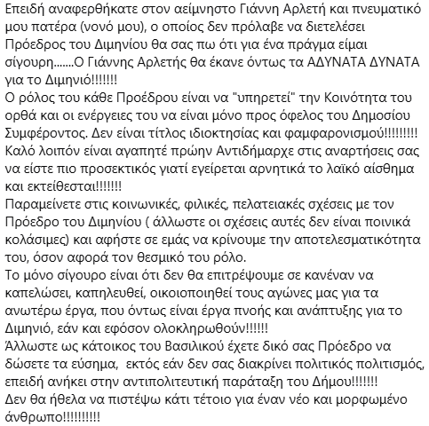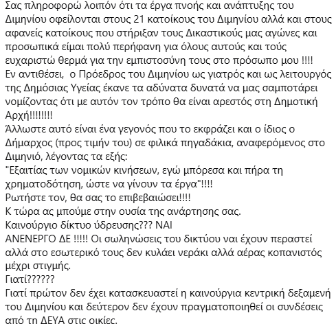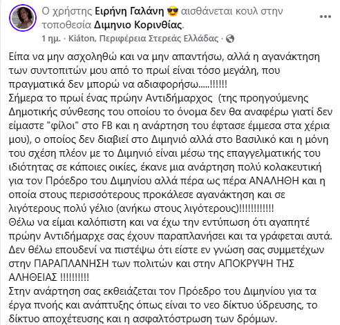 Οι αναφορές που κάνει παρακάτω η Ε. Γαλάνη στον πρώην αντιδήμαρχο Σικυωνίων και τον τοπικό πρόεδρο Διμηνιού έχουν γίνει θέμα συζήτησης στην εν λόγω περιοχή!
