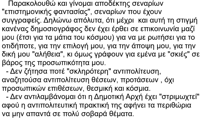 2.Οι δημοσιογράφοι έγραψαν τι συνέβη στο δημοτικό συμβούλιο, τι επικαλεστήκατε στην επιστολή ανεξαρτητοποίησης και έκαναν τα σχόλιά τους! …Τι άλλο έπρεπε να κάνουν; Να επικοινωνούν μαζί σας Δ. Ψυχογιέ για να αναζητήσουν “τη δική σας αλήθεια”, όπως γράφετε στην παρακάτω ανακοίνωση; Οι πολιτικοί λόγοι της επιστολής σας που διαβάστηκαν στη συνεδρίαση του δημοτικού συμβουλίου δεν έφταναν; Αν εσείς πάλι διαφωνείτε στην όποια κριτική των δημοσιογράφων στέλνετε μία επιστολή δημοσίευσης και μετά είναι θέμα των δημοσιογράφων αν θα απαντήσουν σε αυτή! Έτσι γίνεται τόσα χρόνια σε ότι αφορά πολιτικά πρόσωπα και κριτική!