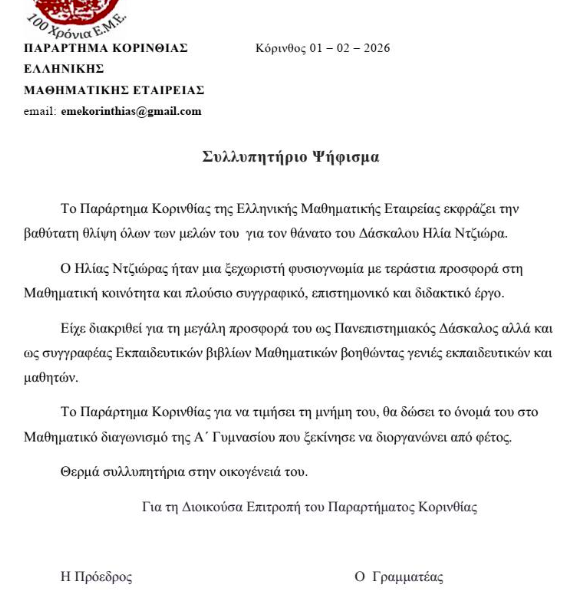 Κοινωνικά ΚΟΡΙΝΘΙΑ: Εκφράζουν την θλίψη τους για το θάνατο του δασκάλου… 2 Φεβρουαρίου, 2026 FacebookTwitterPinterestWhatsApp Η ανακοίνωση από το Παράρτημα Κορινθίας Ελληνικής Μαθηματικής Εταιρείας::