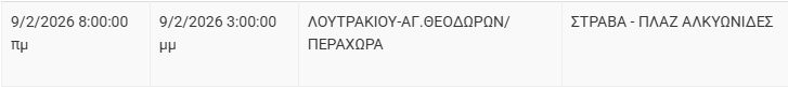 Από τον ΔΕΔΔΗΕ Κορίνθου αναφέρεται: «Λόγω εργασιών συντήρησης του Δικτύου του ΔΕΔΔΗΕ θα πραγματοποιηθεί διακοπή ηλεκτροδότησης στην παρακάτω περιοχή:
