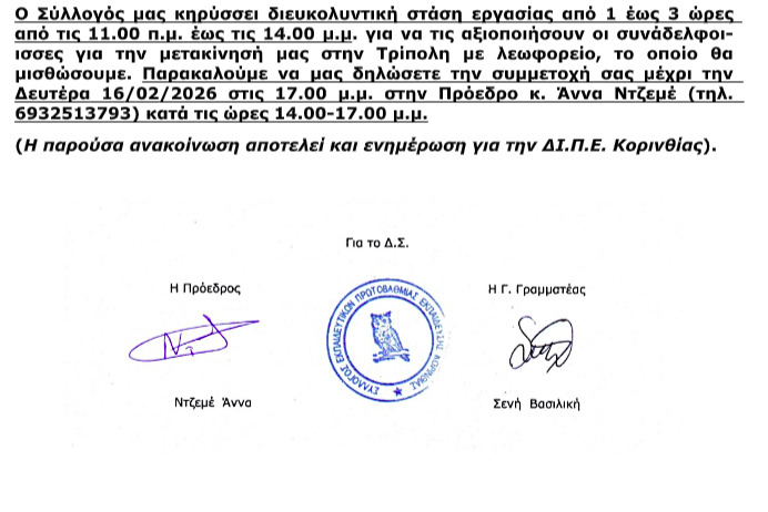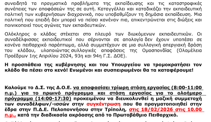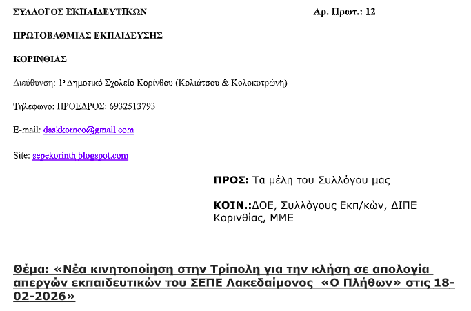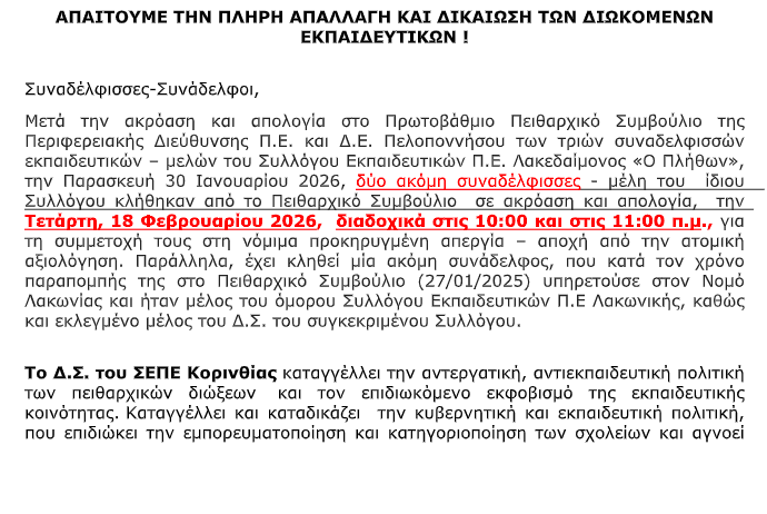 ΚοινωνικάΠολιτικά ΚΟΡΙΝΘΙΑ: Καταγγέλλουν την αντεργατική, αντιεκπαιδευτική πολιτική των πειθαρχικών διώξεων 16 Φεβρουαρίου, 2026 FacebookTwitterPinterestWhatsApp Η ανακοίνωση από το σύλλογο Εκπαιδευτικών Πρωτοβάθμιας Εκπαίδευσης Κορινθίας: