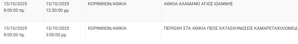 Από τον ΔΕΔΔΗΕ Κορίνθου αναφέρεται: «Λόγω εργασιών συντήρησης του Δικτύου του ΔΕΔΔΗΕ θα πραγματοποιηθεί διακοπή ηλεκτροδότησης στις παρακάτω περιοχές: