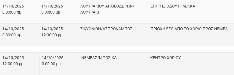 Από τον ΔΕΔΔΗΕ Κορίνθου αναφέρεται: «Λόγω εργασιών συντήρησης του Δικτύου του ΔΕΔΔΗΕ θα πραγματοποιηθεί διακοπή ηλεκτροδότησης στις παρακάτω περιοχές: