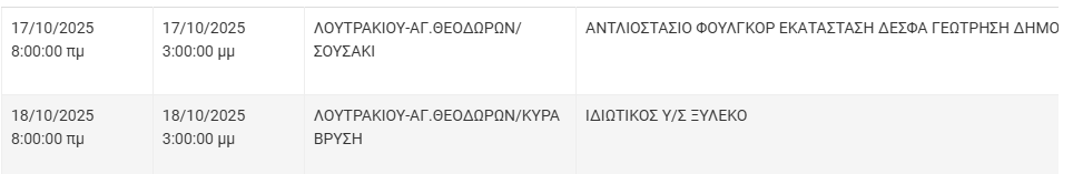Από τον ΔΕΔΔΗΕ Κορίνθου αναφέρεται: «Λόγω εργασιών συντήρησης του Δικτύου του ΔΕΔΔΗΕ θα πραγματοποιηθεί διακοπή ηλεκτροδότησης στις παρακάτω περιοχές:
