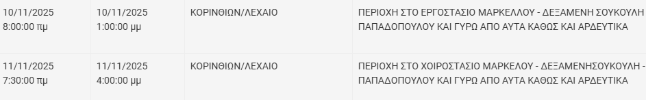 Από τον ΔΕΔΔΗΕ Κορίνθου αναφέρεται: «Λόγω εργασιών συντήρησης του Δικτύου του ΔΕΔΔΗΕ θα πραγματοποιηθεί διακοπή ηλεκτροδότησης στις παρακάτω περιοχές: