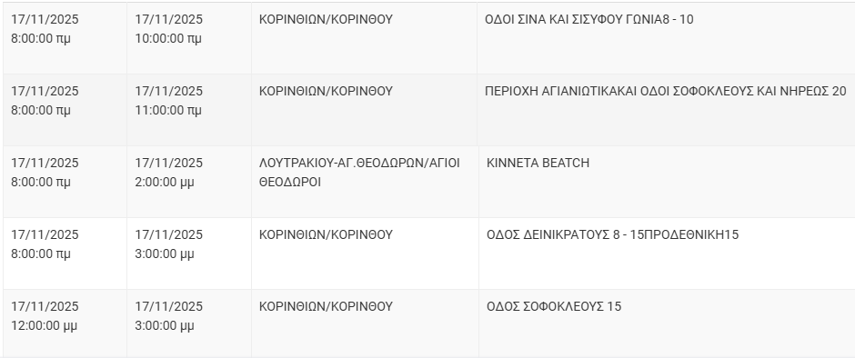 Από τον ΔΕΔΔΗΕ Κορίνθου αναφέρεται: «Λόγω εργασιών συντήρησης του Δικτύου του ΔΕΔΔΗΕ θα πραγματοποιηθεί διακοπή ηλεκτροδότησης στις παρακάτω περιοχές: