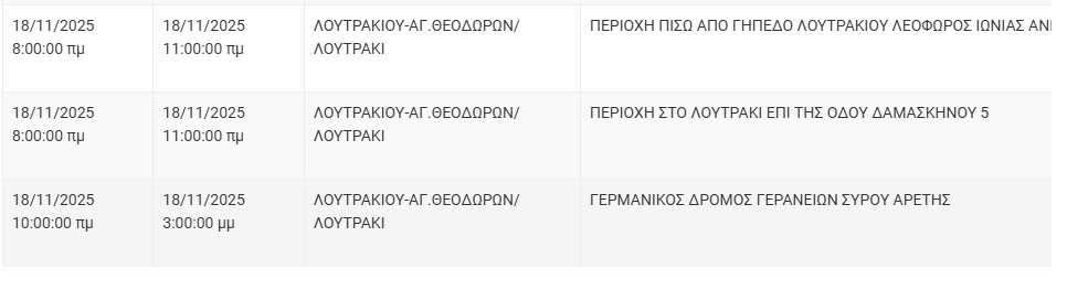 Από τον ΔΕΔΔΗΕ Κορίνθου αναφέρεται: «Λόγω εργασιών συντήρησης του Δικτύου του ΔΕΔΔΗΕ θα πραγματοποιηθεί διακοπή ηλεκτροδότησης στις παρακάτω περιοχές: