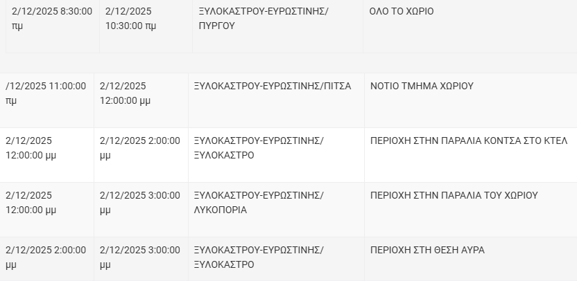 Από τον ΔΕΔΔΗΕ Κορίνθου αναφέρεται: «Λόγω εργασιών συντήρησης του Δικτύου του ΔΕΔΔΗΕ θα πραγματοποιηθεί διακοπή ηλεκτροδότησης στις παρακάτω περιοχές: