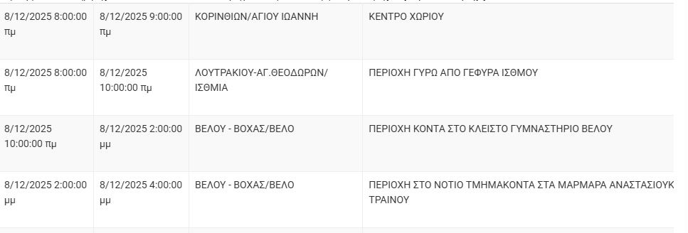 Από τον ΔΕΔΔΗΕ Κορίνθου αναφέρεται: «Λόγω εργασιών συντήρησης του Δικτύου του ΔΕΔΔΗΕ θα πραγματοποιηθεί διακοπή ηλεκτροδότησης στις παρακάτω περιοχές: