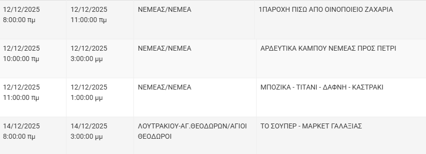 Από τον ΔΕΔΔΗΕ Κορίνθου αναφέρεται: «Λόγω εργασιών συντήρησης του Δικτύου του ΔΕΔΔΗΕ θα πραγματοποιηθεί διακοπή ηλεκτροδότησης στις παρακάτω περιοχές:
