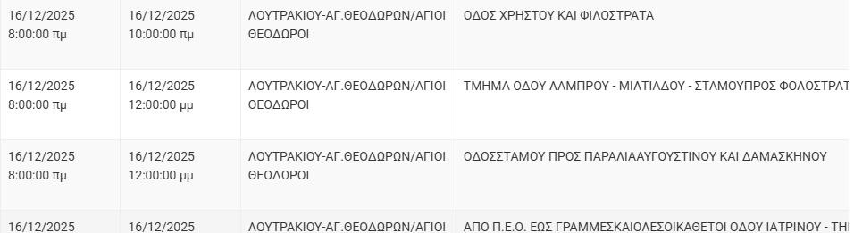 Από τον ΔΕΔΔΗΕ Κορίνθου αναφέρεται: «Λόγω εργασιών συντήρησης του Δικτύου του ΔΕΔΔΗΕ θα πραγματοποιηθεί διακοπή ηλεκτροδότησης στις παρακάτω περιοχές: