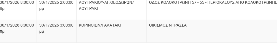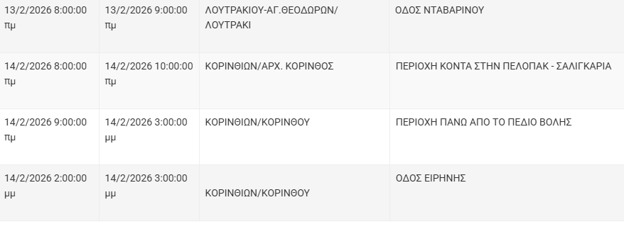 Από τον ΔΕΔΔΗΕ Κορίνθου αναφέρεται: «Λόγω εργασιών συντήρησης του Δικτύου του ΔΕΔΔΗΕ θα πραγματοποιηθεί διακοπή ηλεκτροδότησης στις παρακάτω περιοχές:
