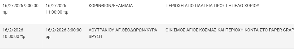 Από τον ΔΕΔΔΗΕ Κορίνθου αναφέρεται: «Λόγω εργασιών συντήρησης του Δικτύου του ΔΕΔΔΗΕ θα πραγματοποιηθεί διακοπή ηλεκτροδότησης στις παρακάτω περιοχές: