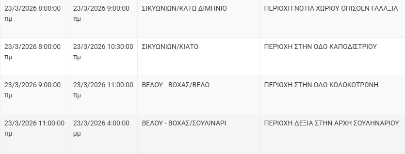 Από τον ΔΕΔΔΗΕ Κορίνθου αναφέρεται: «Λόγω εργασιών συντήρησης του Δικτύου του ΔΕΔΔΗΕ θα πραγματοποιηθεί διακοπή ηλεκτροδότησης στις παρακάτω περιοχές:
