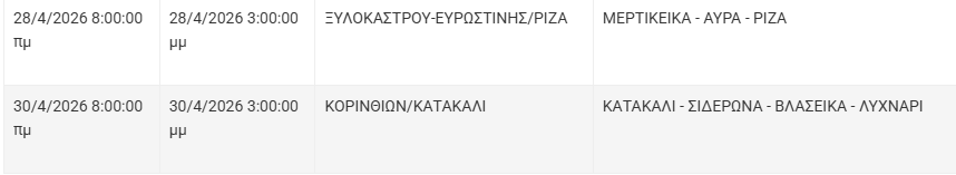 ΚΟΡΙΝΘΙΑ: Οι διακοπές ρεύματος που θα γίνουν την Τρίτη και την Πέμπτη