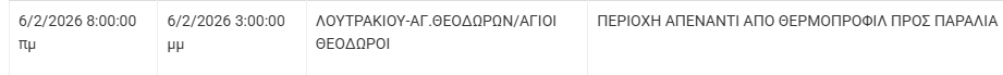 Από τον ΔΕΔΔΗΕ Κορίνθου αναφέρεται: “Λόγω εργασιών συντήρησης του Δικτύου του ΔΕΔΔΗΕ θα πραγματοποιηθεί διακοπή ηλεκτροδότησης στην παρακάτω περιοχή: