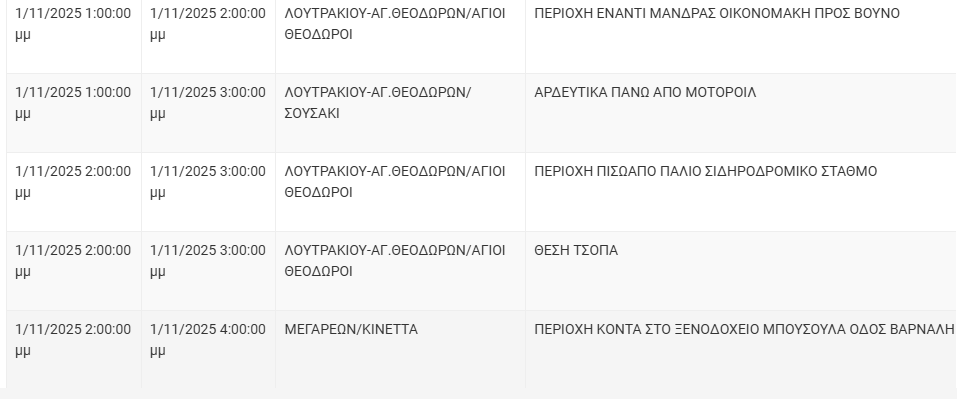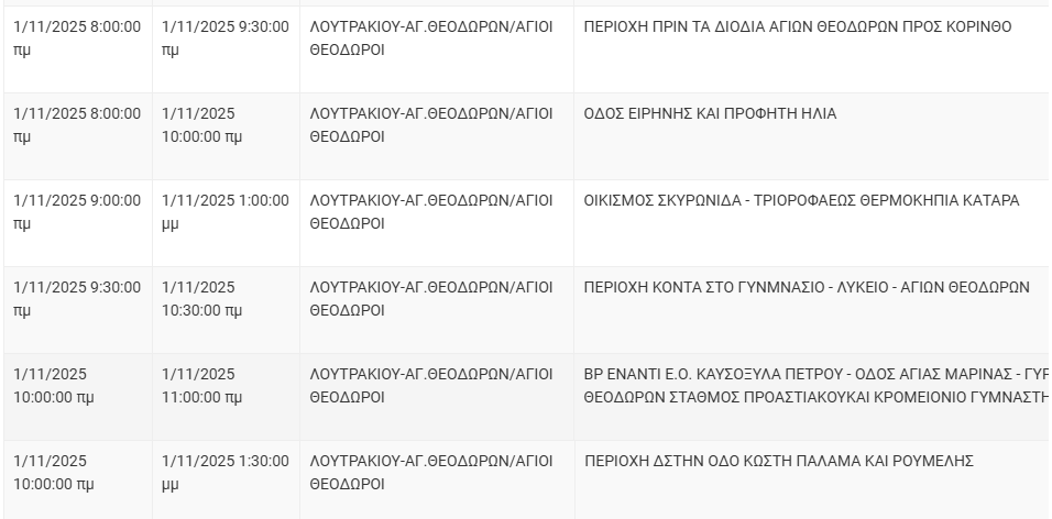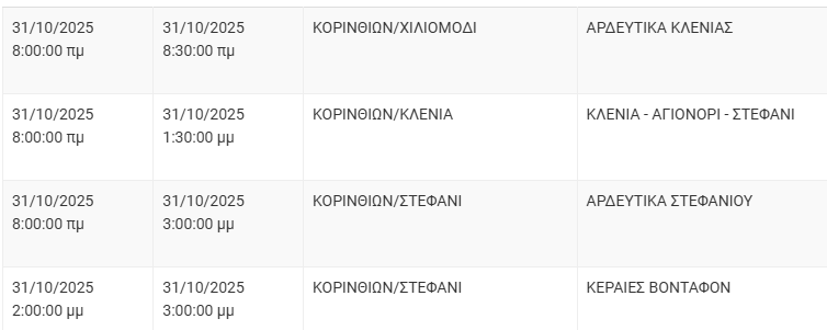 Από το ΔΕΔΔΗΕ Κορίνθου αναφέρεται: “Λόγω εργασιών συντήρησης του Δικτύου του ΔΕΔΔΗΕ θα πραγματοποιηθεί διακοπή ηλεκτροδότησης στις παρακάτω περιοχές: