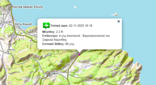 Κοινωνικά ΚΟΡΙΝΘΙΑ: Σεισμική δόνηση κοντά στο Σοφικό με εστιακό βάθος 90 χιλιομέτρων (φωτο) 4 Νοεμβρίου, 2025 FacebookTwitterPinterestWhatsApp Ασθενής σεισμική δόνηση 2,3 Ρίχτερ και με εστιακό βάθος 90 χιλιόμετρων σημειώθηκε την Κυριακή το απόγευμα κοντά στο Σοφικό Κορινθίας Το επίκεντρο του σεισμού: Κ.Ν