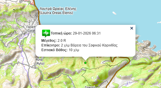 Κοινωνικά ΚΟΡΙΝΘΙΑ: Σεισμική δόνηση κοντά στο Σοφικό (φωτο) 29 Ιανουαρίου, 2026 FacebookTwitterPinterestWhatsApp Ασθενής σεισμική δόνηση 2,0 Ρίχτερ σημειώθηκε σήμερα τα ξημερώματα κοντά στο Σοφικό Κορινθίας Το επίκεντρο του σεισμού: Κ.Ν