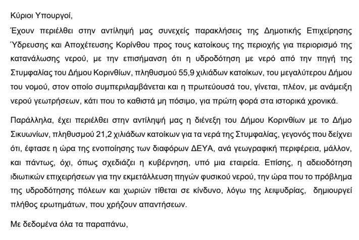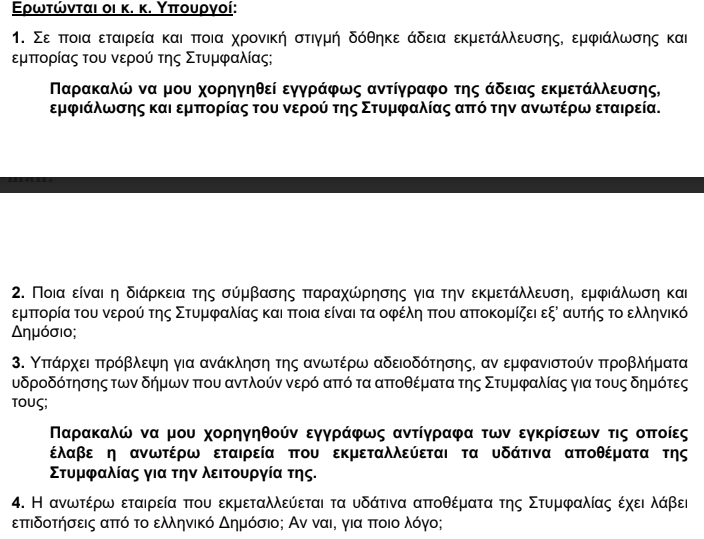 Παρακάτω η ερώτηση που έχει κατατεθεί στους υπουργούς από την Ελληνική Λύση σχετικά με το νερό της Στυμφαλίας και την κόντρα των δήμων Κορινθίων και Σικυωνίων. Επίσης και για το ποια εταιρεία και ποια χρονική στιγμή δόθηκε άδεια εκμετάλλευσης, εμφιάλωσης και εμπορίας του νερού της Στυμφαλίας