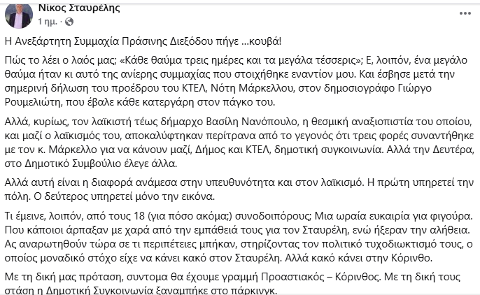 Σε ανάρτησή του ο κύριος Σταυρέλης επικαλούμενος ιδιωτική!! συνομιλία του προέδρου του ΚΤΕΛ με τον Γιώργο Ρουμελιώτη (όπως ο ίδιος ο κ Ρουμελιώτης μου ανέφερε σήμερα) που δημοσιεύτηκε στο διαδίκτυο, καταφέρεται στην πλειοψηφία των μελών του δημοτικού συμβουλίου και προσωπικά σε μένα, με ψευδή στοιχεία και ισχυρισμούς.