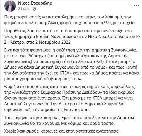 Αν επίσης καταλάβαμε καλά στην άλλη (παρακάτω) ανάρτηση του Ν. Σταυρέλη γίνεται προσπάθεια από τον δήμαρχο …να διαστρεβλώσει την αλήθεια με ένα απόσπασμα συνέντευξής του το 2022 όπου ο Νανόπουλος μιλούσε για ΑΣΤΙΚΗ και όχι ΔΗΜΟΤΙΚΗ συγκοινωνία! Και πριν “κοπεί” το βίντεο ο Νανόπουλος μήπως ανέφερε ότι εξετάζει εναλλακτικές λύσεις της δημοτικής συγκοινωνίας τις οποίες περιέλαβε στη σύμβαση με την μοτορ οίλ μετά την γνωμοδότηση νομικού; …Λέμε μήπως!