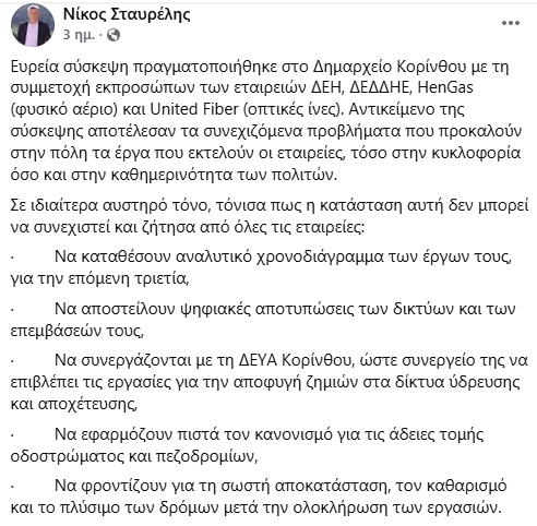 Η ανάρτηση του Ν. Σταυρέλη πριν από τρεις μέρες: